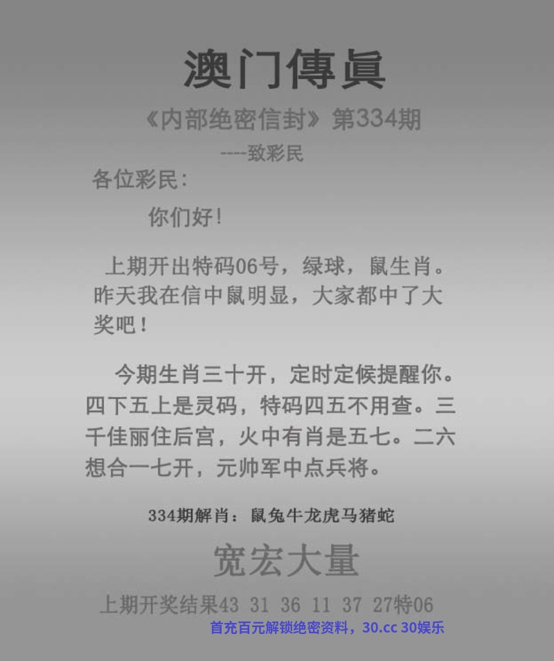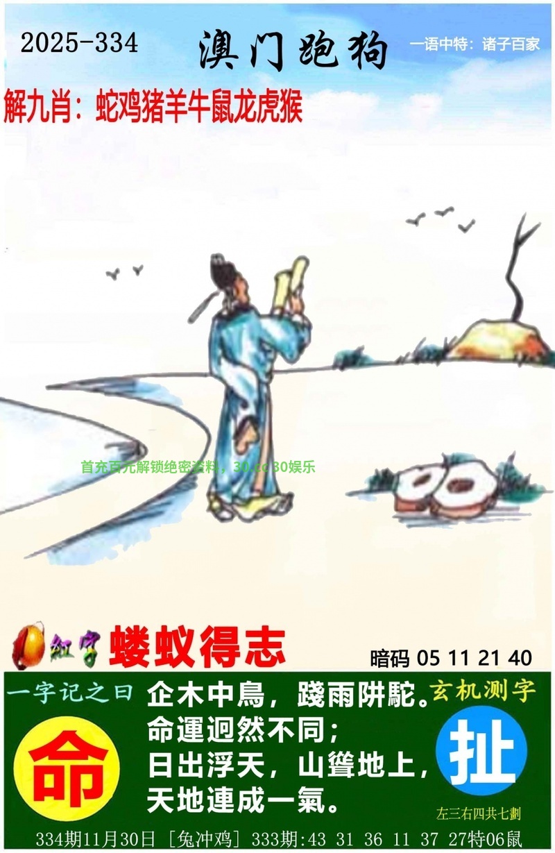 传真334期 今期生肖三十开,定时定候提醒你。 四下五上是灵码,特码四五不用查。 三千佳丽住后宫,火中有肖是五七。 二六想合一七开,元帅军中点兵将。 宽宏大量 解:今期四下五上是灵码,解四头特码40-49,火中有肖是五七,解火肖蛇马。 拐特生肖:鸡蛇鼠兔牛羊虎猴狗 |