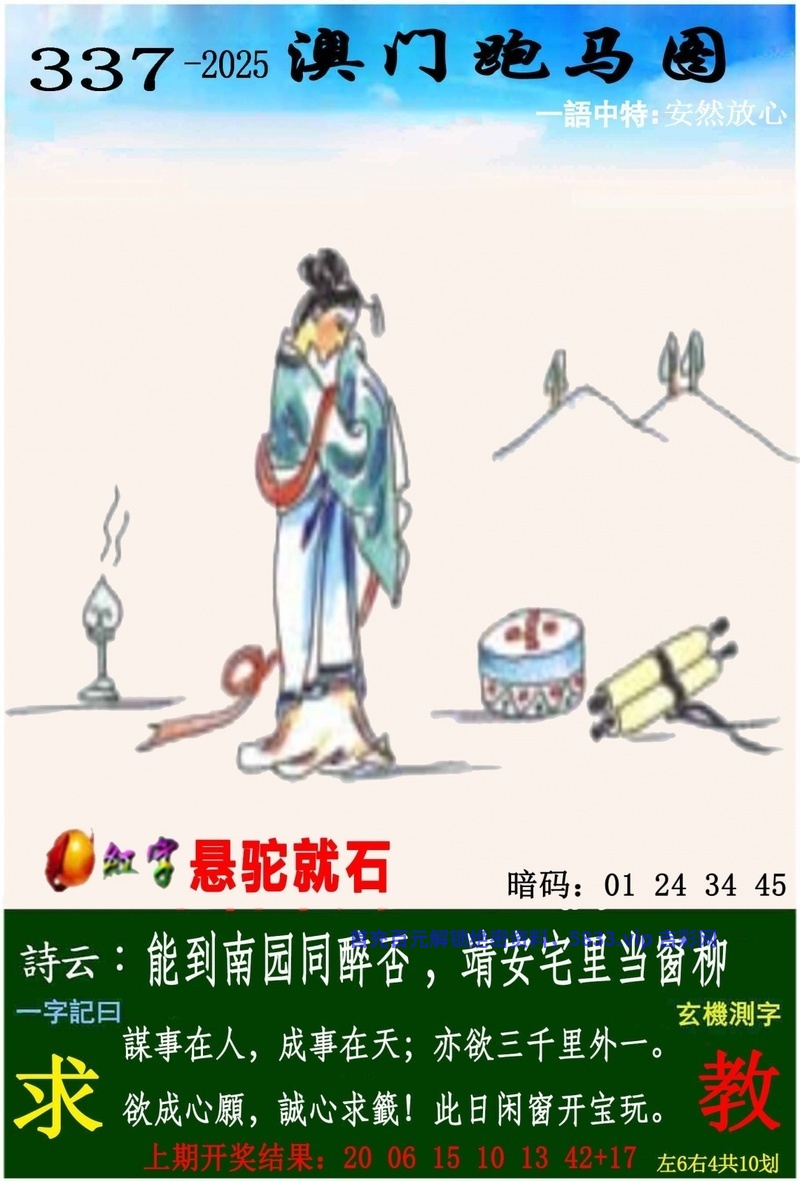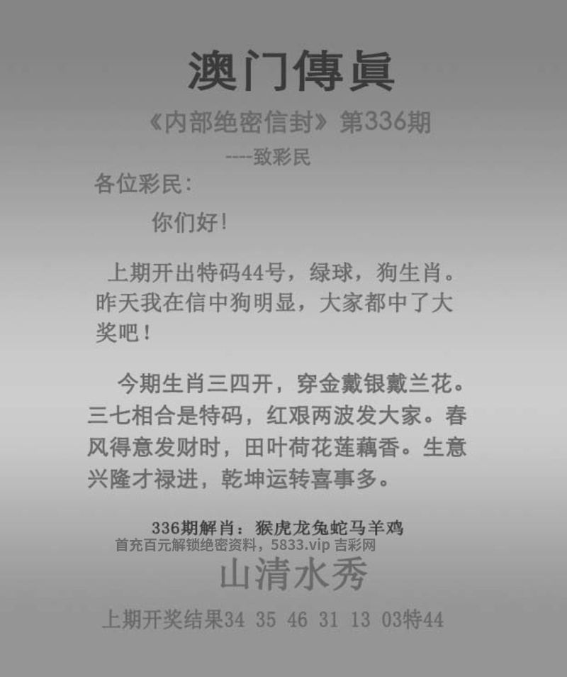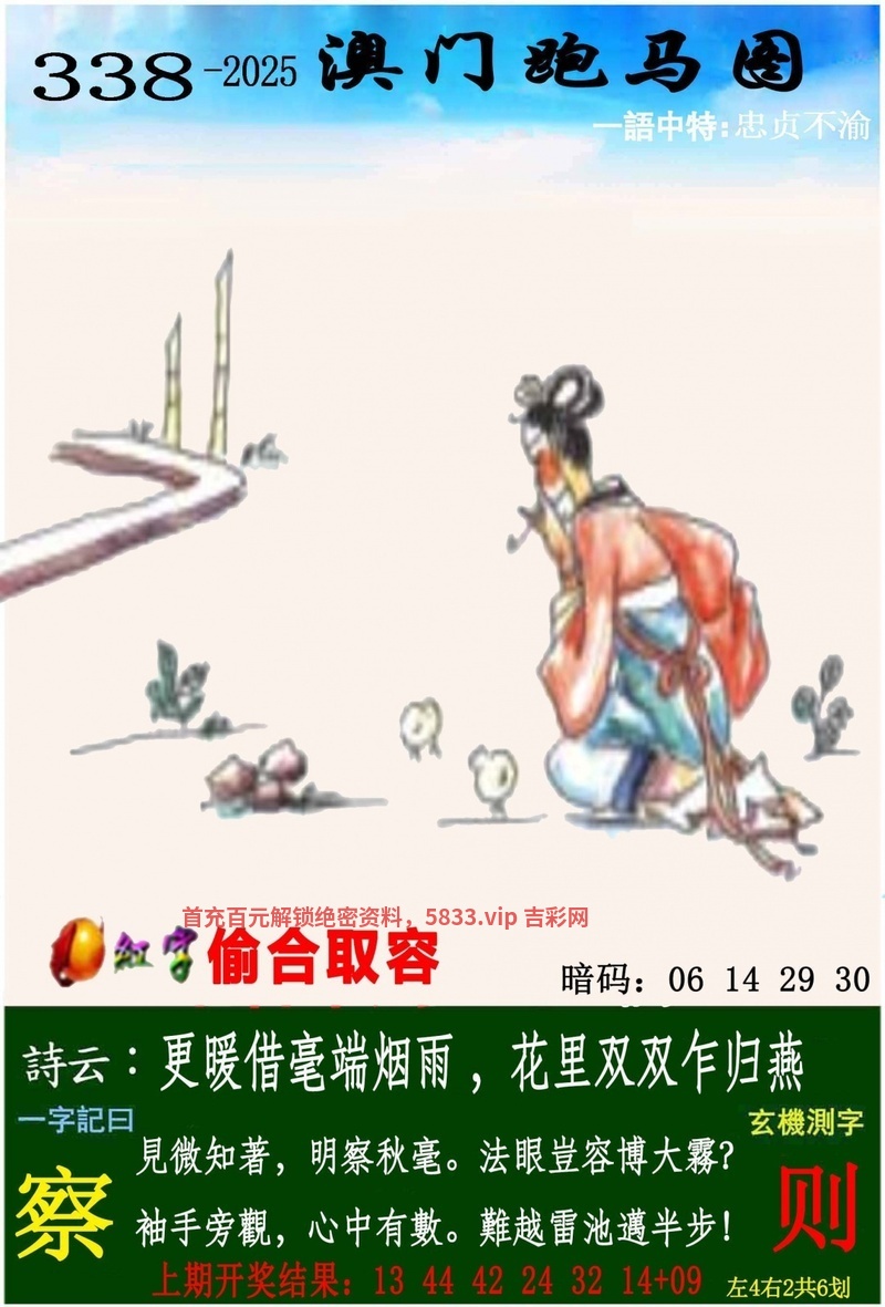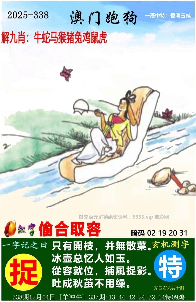 传真336期 今期生肖三四开,穿金戴银戴兰花。 三七相合是特码,红艰两波发大家。 春风得意发财时,田叶荷花莲藕香。 生意兴隆才禄进,乾坤运转喜事多。 山清水秀 解:今期三七相合是特码,解单肖兔牛猪鸡羊蛇,红艰两波发大家,解红波。 拐特生肖:龙蛇牛狗马羊鼠虎鸡 主特:26.38.13.25.17.29.20.32.24.36.23.35 |